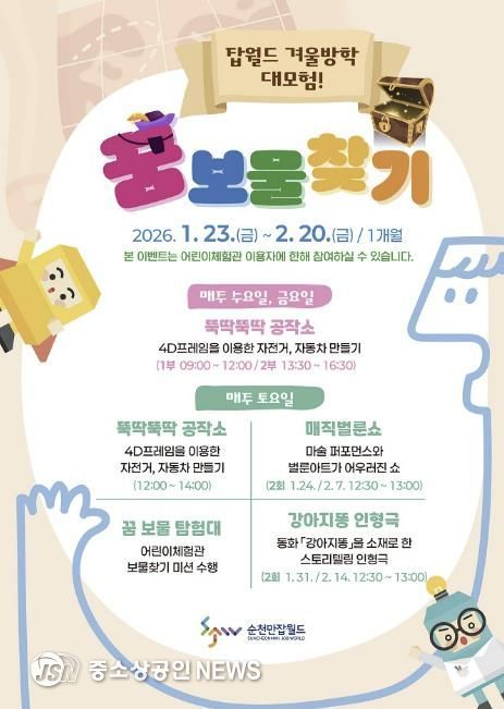 순천시는 오는 1월 23일부터 2월 20일까지 한 달간 겨울방학을 맞아 순천만잡월드에서 '겨울방학 대모험! 꿈 보물찾기' 이벤트를 개최한다.