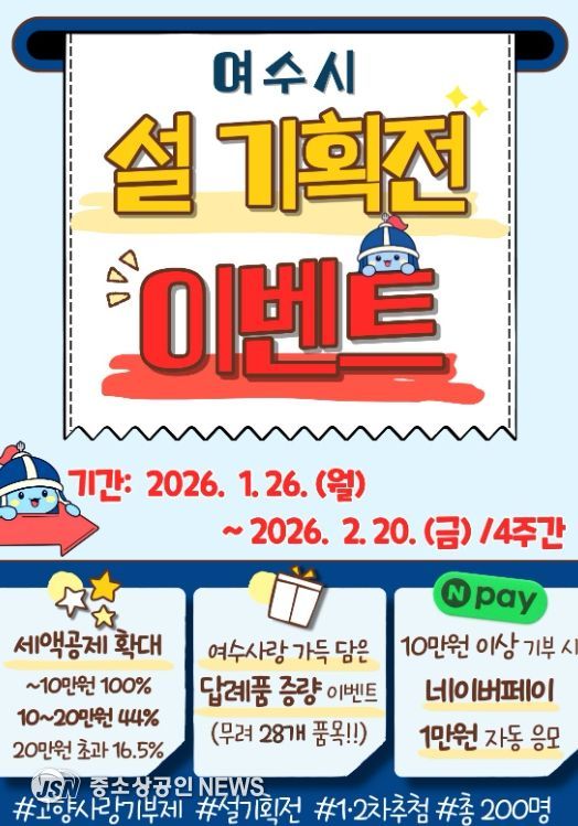 여수시가 설 명절을 맞아 고향사랑기부제 참여 분위기 확산을 위해 1월 26일부터 2월 20일까지 ‘고향사랑기부제 설 명절 특별 이벤트’를 진행한다.