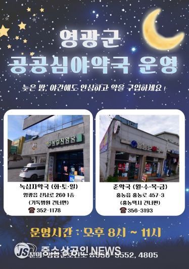 영광군은 오는 2월 9일부터 공공심야약국 2개소를 지정하여 매일 오후 8시부터 11시까지 운영한다고 밝혔다.