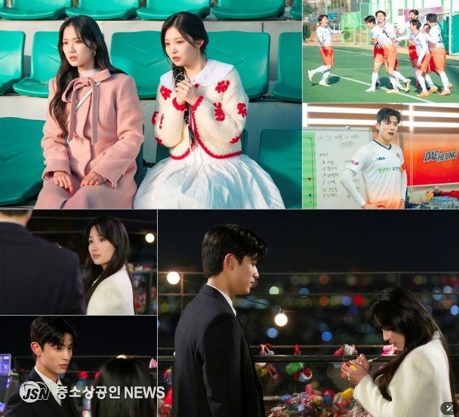 이로써 은호와 강시열의 로맨스 향방에 귀추가 주목되는 가운데, 이날 공개된 사진 속 ‘망생’ 탈출을 넘어 ‘망생’ 적응에 나선 두 사람의 모습이 흥미를 유발한다. 친구 현우석(장동주 분)과 운명이 바뀌면서, 해외 유명 구단에서 국내 4부 리그 소속이 된 강시열. 하지만 언젠가 되돌아갈 날만 꿈꾸며 ‘대흥시민구단’의 감독과 선수들, 유니폼조차 거들떠보지 않던 그가 필드로 다시 돌아온다. 왼팔에 두른 주장 완장은 물론, 경기장과 라커룸의 온도차 카리스마가 시선을 사로잡는다. 여기에 강시열의 ‘본업 모먼트’를 1열에서 직관 중인 은호와 팔미호도 눈길을 끈다. 두 손을 꼭 쥐고 조마조마한 표정으로 경기를 지켜보는 진심 가득한 응원 모드가 미소를 자아낸다.