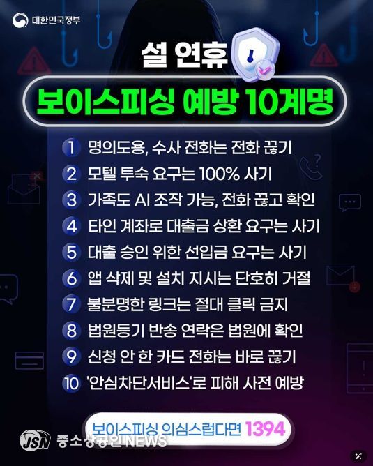 설 연휴 보이스피싱 예방 10계명 ① 명의도용, 수사 전화는 전화 끊기 ② 모텔 투숙 요구는 100% 사기 ③ 가족도 AI 조작 가능, 전화 끊고 확인 ④ 타인 계좌로 대출금 상환 요구는 사기 ⑤ 대출 승인 위한 선입금 요구는 사기 ⑥ 앱 삭제 및 설치 지시는 단호히 거절 ⑦ 불분명한 링크는 절대 클릭 금지 ⑧ 법원등기 반송 연락은 법원에 확인 ⑨ 신청 안 한 카드 전화는 바로 끊기 ⑩ '안심차단서비스'로 피해 사전 예방