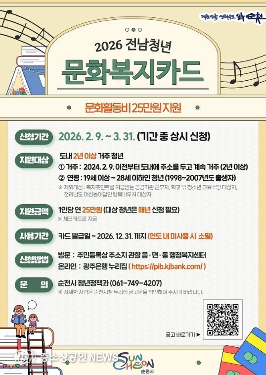 순천시는 청년들의 문화생활 향유 및 자기계발 활동을 지원하기 위해 2026년 전남청년 문화복지카드 지원사업 대상자를 오는 3월 31일까지 모집한다.
