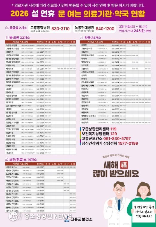 한편, 설 연휴 기간 진료가 가능한 의료기관과 약국 정보는 고흥군보건소 누리집이나 응급의료포털에서 확인할 수 있으며, 고흥군 보건소로 문의하면 자세히 안내받을 수 있다.