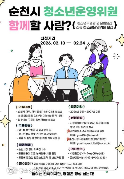 모집은 2월 24일까지 순천시에 거주하거나 관내 재학 중인 9세~24세 청소년을 대상으로 하며, 자세한 사항은 각 시설 누리집 및 순천시청소년수련관 또는 문화의 집을 통해 안내받을 수 있다.