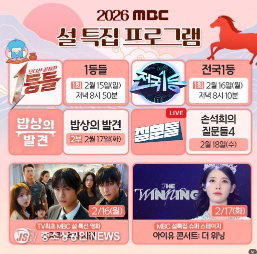 이번 설에는 전 세대가 함께 즐기는 레전드 콘서트 또한 준비되어있다. ‘MBC 설특집 슈퍼 스테이지 아이유 콘서트: 더 위닝’이 설 당일인 17일 방송 예정이다. 수많은 명곡을 선보이며 독보적인 음악성과 무대 장악력으로 서울 월드컵 경기장을 가득 채운 아이유의 공연 실황을 안방에서 즐길 수 있다. 한편, 아이유는 '21세기 대군부인'에서 신분 빼고 다 가진 재벌 성희주 역으로 2026년 4월 안방극장을 찾을 예정이다.