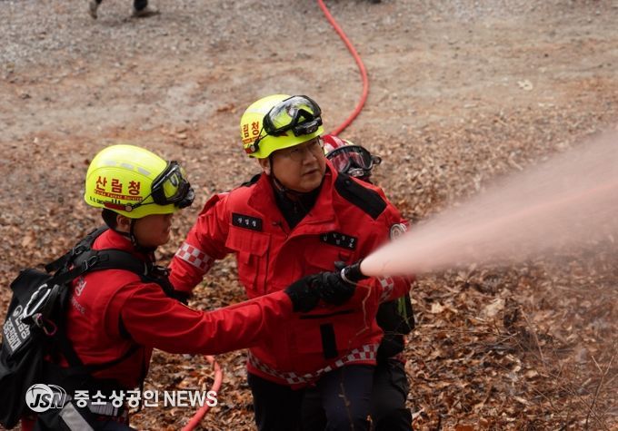이날 김인호 산림청장은 세계문화유산인 영월 장릉을 대상으로 직접 산불지연제 예방 살포 훈련에 참여하며 산불 현장 대응 능력을 점검했다.