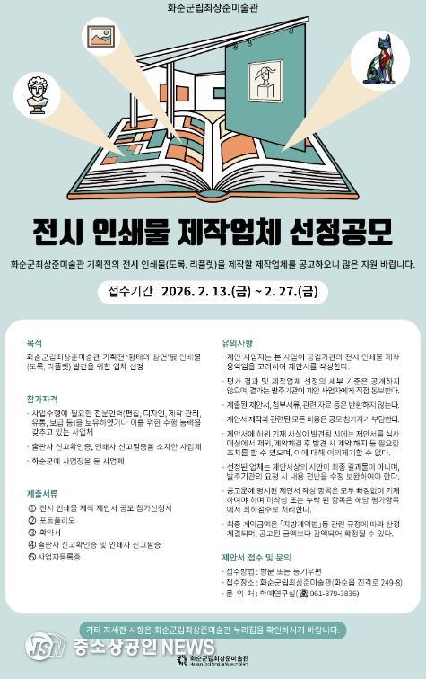 화순군은 12일 화순군립최상준미술관 기획전 ‘형태의 잠언’ 展 전시 인쇄물(도록, 리플릿) 제작을 전문적으로 수행할 업체를 공개 모집한다고 밝혔다.