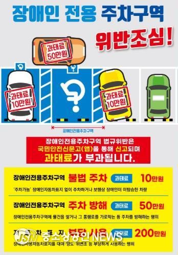 위반 유형별 과태료 기준은 ▲불법주차 10만 원(장애인주차표지 미발급 차량 주차, 전용구역 침범, 표지 미부착 등) ▲주차방해 50만 원(전용주차구역 내 또는 주변에 물건 적치, 2면 이상 이용 방해 행위) ▲장애인주차표지 부당 사용 200만 원(표지 위·변조, 대여 등)이다.