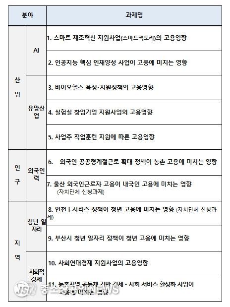 이날 회의에서는 2026년도 평가대상 후보과제에 대해서도 심의가 이뤄졌는데, 그간 고용 및 산업 전문가, 관계부처, 자치단체 등의 의견수렴 등을 거쳐 11개 후보과제가 발굴되었고, AI 등 유망산업분야(5개), 외국인 고용 등 인구구조분야(2개), 청년일자리・사회적 경제 등 지역정책분야(4개) 등 일자리에 영향을 미치는 주요 정책과제들로 확정되었다.