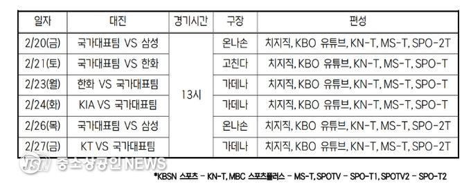 3월에 열리는 월드베이스볼클래식(이하 WBC)에 대비해 일본 오키나와에 훈련 캠프를 차리는 대한민국 국가대표팀의 평가전 일정과 중계가 확정됐다.