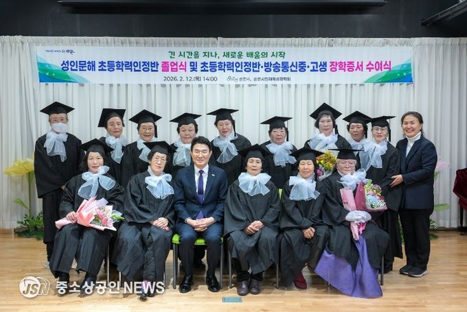 순천시는 지난 12일 삼산도서관 시청각실에서 2025학년도 성인문해초등학력인정반 졸업식과 장학증서 수여식을 개최했다.