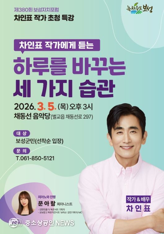 보성군은 오는 3월 5일 오후 3시, 채동선 음악당에서 국내 대표 배우이자 베스트셀러 작가인 차인표 작가를 초청해 제380회 보성자치포럼을 개최한다.