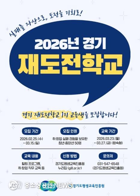 박명혜 경기도평생교육진흥원장 직무대행은 “실패는 끝이 아니라 또 다른 도전의 출발점”이라며 “재도전학교를 통해 참여자들이 심리적 안정과 실질적 역량을 동시에 갖추고 새로운 출발을 할 수 있도록 적극 지원하겠다”고 말했다.