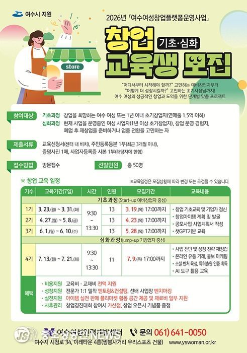 여수시는 여성의 창업 역량을 강화하고 지역경제 활성화를 위해 3월부터 ‘여수 여성 창업플랫폼 사업’을 추진한다고 밝혔다.