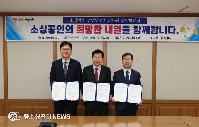 대구 중구는 지난 24일 구청 상황실에서 대구신용보증재단, iM뱅크 중구청지점과 업무협약을 체결하고 고금리 장기화와 내수 회복 지연으로 어려움을 겪는 소상공인의 자금난 해소와 이자 부담 완화를 위해 총 30억 원 규모의 ‘2026년 소상공인 경영안정자금’을 지원한다.