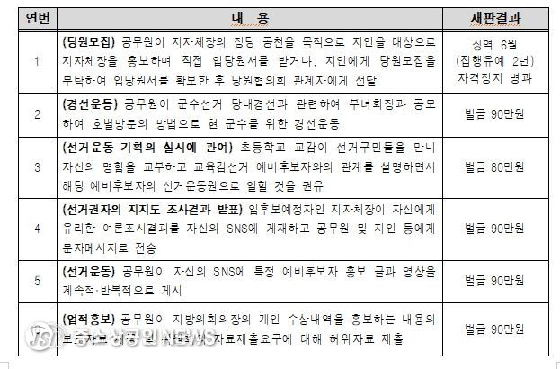 중앙선거관리위원회는 제9회 전국동시지방선거를 앞두고 공무원 및 산하기관 직원 등의 불법 선거관여행위에 대한 예방·단속활동을 강화하고 있다고 밝혔다.