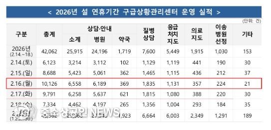 소방청은 2026년 설 연휴 기간(2.14.~2.18., 5일간)전국 총 45,082건의 구급 출동으로 24,166명을 이송하였으며, 구급상황관리센터에서 총 42,062건의 상담을 실시했다고 밝혔다.