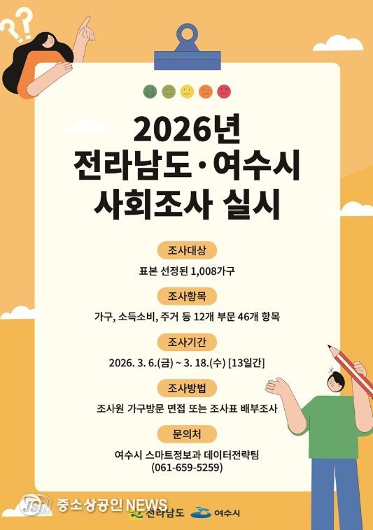 여수시는 3월 6일부터 3월 18일까지 13일간 ‘2026년 전라남도·여수시 사회조사’를 실시한다고 밝혔다.
