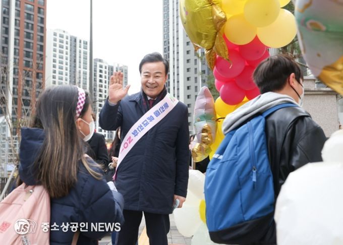 김성제 의왕시장이 3월 3일 의왕푸른초등학교의 개교를 맞아 학생들의 첫 등교를 축하했다.