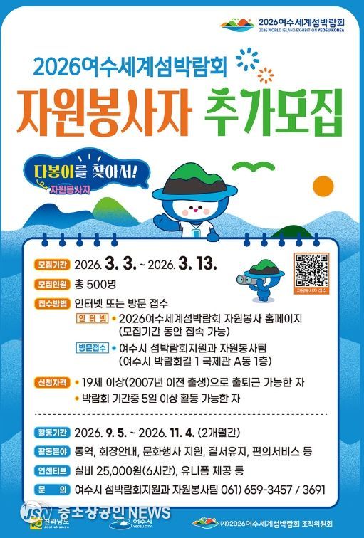 여수시가 2026여수세계섬박람회의 성공적인 개최를 위해 박람회의 주역이 될 자원봉사자, 공식 애칭 ‘다봉이’ 추가 모집에 나선다.