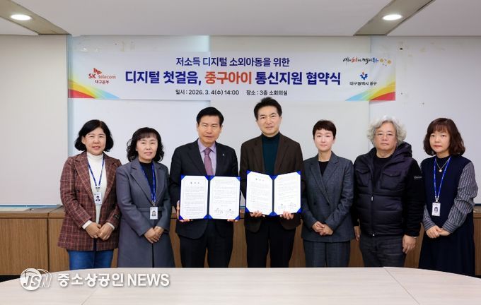 대구 중구와 ㈜SK텔레콤 대구본부(본부장 김상범)는 지난 4일 저소득 디지털 소외 아동의 정보격차 해소와 디지털 접근성 보장을 위한 ‘디지털 첫걸음, 중구아이 통신지원’ 업무협약을 체결했다.