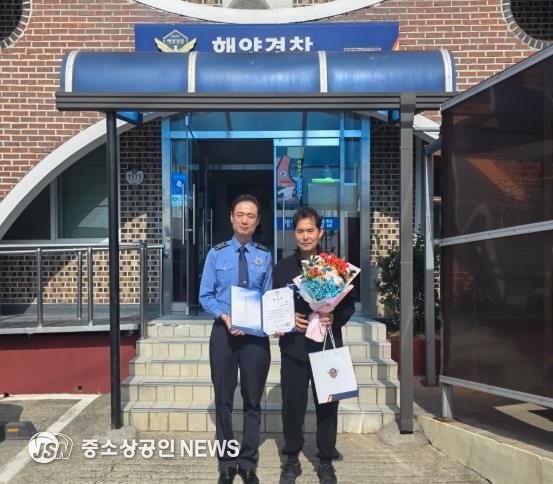 완도해양경찰서는 지난달 20일 전남 장흥군 신동항 인근 해상에서 발생한 침수선박 사고 현장에서 승선원 4명을 구조한 김천권 선장에게 감사장을 수여했다.