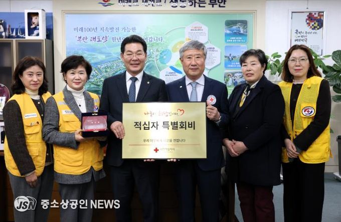 부안군은 기부문화 확산과 적십자 회비 모금에 군민들의 자발적 참여 분위기를 조성하기 위해 6일 군수실에서 2026년도 적십자 특별회비 전달식을 갖고 대한적십자사 전북지사에 특별회비를 전달했다고 밝혔다.