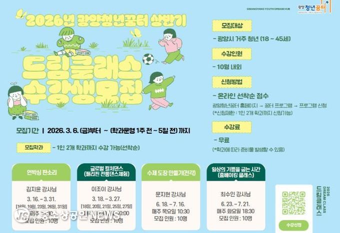 광양청년꿈터는 지역 청년이 직접 기획하고 운영하는 청년 주도형 학습 프로그램 ‘2026년 상반기 드림클래스’ 수강생을 모집한다고 밝혔다.