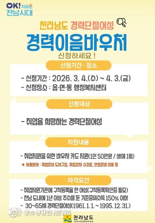 지원 대상은 취업지원기관(여성새로일하기센터, 고용복지플러스센터 등)에 구직을 등록한 30세부터 65세 이하 여성으로 신청일 기준 전라남도에 1년 이상 주소를 두고 있으며 전월 건강보험료가 기준 중위소득 150% 이하인 경우다.