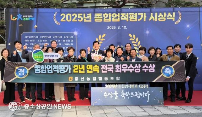 용산농협은 지난 3월10일 농협중앙회 본부 대강당에서 열린 ‘2025년 종합업적평가 최우수 농·축협 시상식’에서 종합업적평가 최우수상 수상과 클린뱅크 금 등급을 수상하는 영예를 안았다.