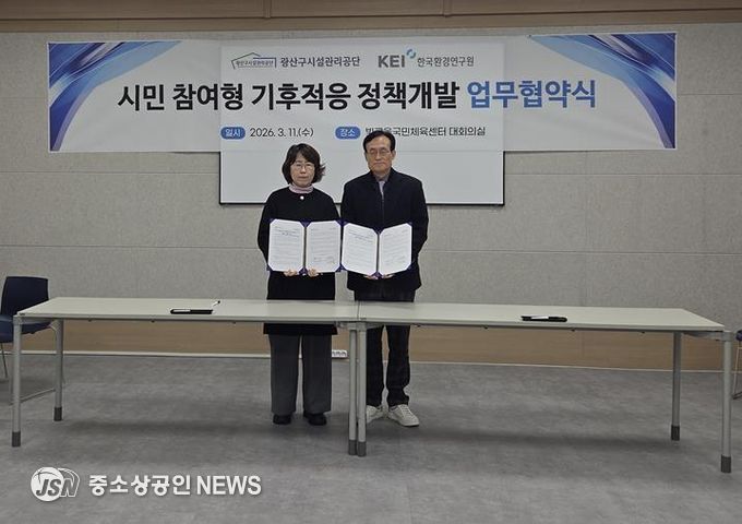 광주광역시광산구시설관리공단은 3월 11일 한국환경연구원(KEI) 기후체제 대응 환경 기술개발 연구단과‘시민 참여형 기후적응 최적화를 위한 시민·사회·경제·환경 데이터 분석을 통한 정책 평가기술 개발’사업의 원활한 추진을 위한 업무협약(MOU)을 체결했다고 밝혔다.