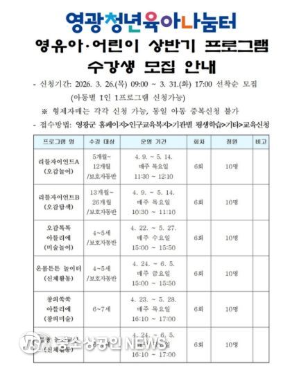 영광군은 ‘영광청년육아나눔터’에서 영유아・어린이를 대상으로 하는 「2026년 상반기 프로그램」 수강생을 모집한다고 밝혔다.