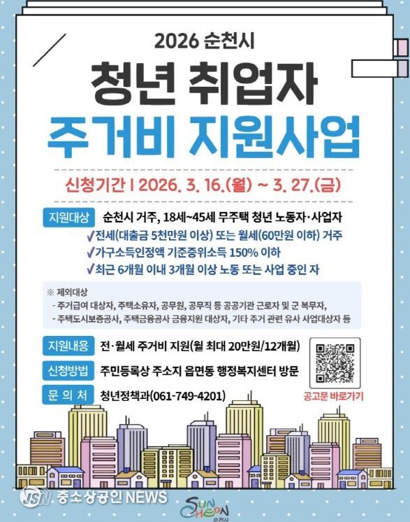 순천시는 성실히 일하는 청년의 주거 안정과 경제적 자립 기반 마련을 위해'청년 취업자 주거비 지원사업' 대상자를 오는 27일까지 모집한다.
