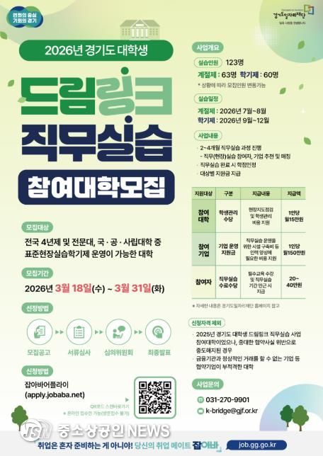 경기도와 경기도일자리재단이 ‘경기도 대학생 드림링크 직무실습’ 사업에 참여할 15개 협력대학을 31일까지 모집한다.