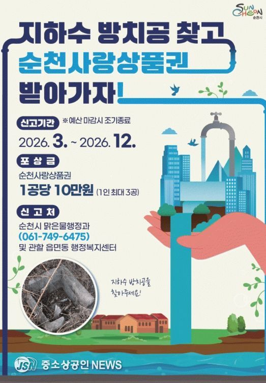 신고 대상은 장기간 미사용 상태로 방치된 지하수 관정으로, 방치공 위치와 현장 사진 등 확인 가능한 자료를 첨부해 순천시 맑은물행정과 또는 관할 읍면동 행정복지센터(온라인·전화·방문 등)를 통해 신고하면 된다.