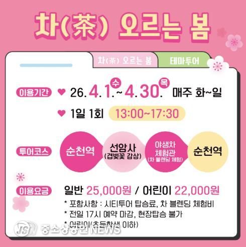 시 관계자는 “이번 ‘차(茶)오르는 봄’ 투어는 순천이 가진 천혜의 자연경관과 야생차(茶)라는 전통 콘텐츠를 산뜻하게 엮어낸 감성투어”라며, “꽃 향과 차 향이 어우러진 순천의 봄날이 순천을 찾는 상춘객들에게 진정한 위로와 휴식이 되길 기대한다”고 말했다.