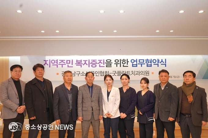 [7일 오전 광주 남구소재 굿플란트치과의원에서 이경수 소상공인연합회 남구지회장(좌측), 이아름 굿플란트치과의원 원장과(우측)소상공인 복지증진을 위한 업무협약식이 이루어졌다]