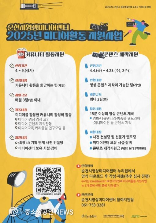 순천시는 순천시영상미디어센터에서‘2025년 미디어활동 지원사업’참여자를 모집한다고 밝혔다.