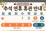 여수시도시관리공단은 대명절 추석 연휴 기간(10월 5일~10월 9일) 동안 공단이 운영 중인 공공 체육시설을 휴관한다고 밝혔다. 휴관 대상은 △진남수영장 △망마국민체육센터 △장애인국민체육센터이며, 정상 운영은 10월 10일(금)부터 재개된다. 다만, 연휴 전 개천절인 10월 3일(금)에는 망마국민체육센터 다목적체육관만 운영하며, 10월 4일(토)에는 진남수영장과 망마국민체육센터가 정상 운영된다. 공단은 추석 연휴 기간에도 시설물 안전관리와 긴급상황 대응을 위해 비상근무 체계를 가동해 시민과 관광객들이 안심할 수 있도록 최선을 다한다는 방침이다. 여수시도시관리공단 이사장은 “민족 최대 명절인 추석을 맞아 가족과 함께 안전하고 따뜻한 시간을 보내시길 바란다”며, “연휴 동안에도 공단은 시민의 안전을 최우선으로 하고, 휴관 이후 더욱 쾌적한 환경에서 체육시설을 이용할 수 있도록 최선을 다하겠다”고 말했다. 시설별 세부 운영 일정은 여수시도시관리공단 공공 체육시설 전용 홈페이지에서 확인할 수 있다.