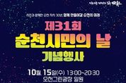 ‘더 큰 미래를 위한 삶의 쉼터, 치유도시 순천!’ 그 새로운 도약을 위한 순천시(시장 노관규)가 오는 15일 오천그린광장 일원에서 24개 읍면동 화합행사와 함께 ‘제31회 순천시민의 날’기념식을 개최한다. 이번 행사는 오후 1시부터 밤 8시 30분까지 28만 순천시민이 하나되어 글로벌 문화산업, 삶이 머무는 치유도시 메카로 발돋움한 일류 순천의 자부심을 높이는 장으로 어울한마당 큰 잔치가 성대하게 펼쳐진다. 이날 펼쳐지는 제31회 순천시민의 날 행사는 지역사회의 화합과 단결을 다짐하고, 순천의 발전을 기념하는 의미있는 시간으로 1부 행사와 2부 행사로 나눠 진행된다. 1부 행사는 오천그린광장 주차장 일원에서 오후 1시부터 오후 5시까지 ▲24개 읍면동 화합을 위한 장기자랑 ▲어린이 한마당 잔치 ▲버블매직쇼 ▲울려라! 도전 순천역사골든벨 ▲읍면동 먹거리부스 ▲순천하세요!(김수련, 양서영, 하숙자 가수의 공연) ▲체험부스 ▲푸짐한 경품 등이 마련돼 가족 단위 방문객에게 인기가 높을 것으로 기대된다. 특히 시민들이 함께 즐길 수 있는 ‘먹거리 부스’에서는 24개 읍면동이 참여해 각 지역을 대표하는 특색