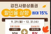 강진군은 9월29일부터 12월31일까지 강진사랑상품권 할인율을 상향 조정한다고 24일 밝혔다. 추석 명절 맞이 및 지역경제 회복을 위해 마련된 할인 혜택은 지류 및 모바일(착) 강진사랑상품권 구매 시 선할인 10%이며, 기간 중 모바일(착) 사용 시 후캐시백 적립 5%로 총 15% 할인 혜택을 받을 수 있다. 구매 한도는 월 70만 원으로 동일하다. 다만, 모바일(착) 상품권 후캐시백은 매월 1억 원을 투입할 예정으로 예산소진 시 운영이 종료되므로 혜택을 받기 위해서는 빠르게 소비하는 것이 유리하다. 관내 모바일(착) 상품권은 음식점, 전통시장, 주유소, 미용실, 병원, 마트 등 지역 내 1,600여 개의 가맹점에서 사용할 수 있다. 자세한 가맹점 안내는 강진군 홈페이지 및 지역상품권 chak(앱) ‘가맹점 찾기’에서 확인할 수 있다. 모바일(착) 상품권 한 이용자는 “상품권을 충전할 때 10% 할인받는 것도 좋지만, 결제할 때마다 캐시백을 적립해 주니 쓰는 재미가 있어서 착을 더 이용한다”며 “명절 연휴뿐만 아니라 3개월동안 15% 할인혜택을 받을 수 있다니 실질적인 도움