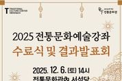 광주문화재단 전통문화관은 오는 12월 6일 오후 2시 전통문화관에서 광주광역시 무형유산 보유자와 수강생이 함께하는 ‘2025 전통문화예술강좌 수료식 및 결과발표회’를 개최한다. 이번 행사는 상·하반기 총 26개 강좌에서 강좌별 15회차 중 70% 이상 출석한 수강생에게 수료증을 수여하고, 무형유산 기·예능 보유자 및 전문강사에게 직접 배운 기량을 선보이기 위해 마련됐다. 수료식은 상·하반기 수강생 수료증 전달식에 이어 1부 기능분야(탱화, 민화, 전통음식) 발표회, 2부 예능분야(판소리, 판소리고법, 가야금병창) 발표회 순으로 진행된다. 2025년 전통문화예술강좌 수강생은 총 269명이다. 상반기 강좌에서는 수강생 140명 중 122명, 하반기 강좌에서는 수강생 129명 중 118명이 수료증을 받을 예정이다. 1부 기능분야 발표회에서는 광주광역시 남도의례음식장 최영자 보유자 강좌의 조아란 수강생, 이애섭 보유자 강좌의 김은수 수강생, 민경숙 보유자 강좌의 안건상 수강생이 전통음식 대표 작품을 소개한다. 또한 광주광역시 탱화장 송광무 보유자가 진행한 탱화 강좌의 김하정 수강생, 전문강사 이성임 화가가