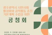 광주광역시는 23일 오후 4시 광주광역시의회 5층 예결위회의실에서 ‘광주광역시 시민사회 활성화와 공익활동 증진을 위한 기본계획(제1차, 2026~2028)’ 최종보고회 겸 공청회를 개최한다. 광주시가 주최하고 광주시민사회지원센터가 주관하는 이번 공청회는 향후 3년간 광주 시민사회의 지속가능한 발전을 위한 정책방향을 최종 확정하기 전 시민사회 현장의 의견을 수렴하기 위해 마련됐다. 광주시는 2023년 ‘광주광역시 시민사회 활성화와 공익활동 증진 조례’를 제정하고, 2024년 7월 기존 ‘광주NGO지원센터’를 ‘광주시민사회지원센터’로 전환하며 시민사회 지원 기반을 확대했다. 올해는 전문가-행정-센터가 참여하는 ‘기본계획수립 전담팀(TF)’을 구성해 본격적인 연구에 착수했다. 전담팀(TF)은 지난 4월부터 수차례 논의와 자문을 거쳐 기본계획의 기틀을 마련했으며, 시민 및 시민사회 설문조사, 활동가 직급별 포커스그룹인터뷰(FGI) 결과를 반영해 비전과 목표, 추진전략을 구체화했다. 이번에 공개되는 기본계획은 ▲시민사회 기반과 역량 강화 ▲시민참여와 활동가 저변 확대 ▲공익활동에 의한 공동체 가치 실현 등