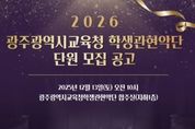 광주시교육청학생교육문화회관은 ‘2026 광주광역시교육청 학생관현악단’ 신규 단원을 모집한다. 시교육청 학생관현악단은 학생들의 음악적 기량과 감수성을 키우기 위해 운영되고 있다. 매주 토요일 합주연습과 연주회, 기획공연 참여 등 다양한 음악 활동을 펼친다. 모집 대상은 광주지역 초등학교 3학년~고등학교 2학년 학생, 같은 연령대 학교 밖 청소년 등이다. 관현악 합주 연주 능력이 있고 음악활동에 관심이 있는 학생, 청소년이라면 오는 3~10일 학교장 추천 서류를 접수하거나 개별 방문 접수하면 된다. 분야는 바이올린, 비올라, 첼로, 콘트라베이스, 플루트, 오보에, 클라리넷, 바순, 호른, 트럼펫, 트럼본, 튜바, 타악기 등이다. 공개 오디션은 오는 13일 오전 10시 학생교육문화회관 지하 1층 학생관현악단 합주실에서 진행된다. 지원자는 자유곡 1곡을 준비해야 하며, 악보를 보고 연주할 수 있다. 단, 반주자는 동반할 수 없으며, 개인 악기를 지참해야 한다.(콘트라베이스, 타악기 제외) 단원 모집 관련 내용은 학생교육문화회관 누리집 공고문 또