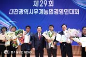 이장우 대전시장이 19일 대전시 농업기술센터에서 열린 제29회 한국후계농업경영인 대전시대회 개회식에서 대전 농업 발전에 기여한 공로로 한국후계농업경영인 대전시연합회로부터 감사패를 받았다. 이번 행사는 ㈔한국후계농업경영인 대전시연합회 주최로 열렸으며, 대전지역 농업인과 농협 관계자, 도시민 등 300여 명이 참석해 농업의 미래를 함께 논의하는 자리가 됐다. 이장우 대전시장은 수상 소감에서 “농업은 국가의 근간 산업으로 식량 안보와 생태계 보전에 중요한 역할을 하고 있다”라며 “과학수도 대전에 걸맞은 첨단기술을 활용해 스마트농업 기반을 조성하고 미래 농업의 성장 동력을 확보하는 데 최선을 다하겠다”라고 말했다.