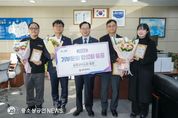 광주광역시는 23일 시청에서 ‘2025년 기부문화 활성화 유공 표창 수여식’을 열었다. 이날 수여식에는 고광완 행정부시장을 비롯해 김국환 신한은행 호남제주본부장, 송원준 맘스터치 용봉점 대표, 조혜림 한국인터넷진흥원 연구원, 임춘근 한국가스공사 과장 등이 참석했다. 올해 기부문화 유공 시장 표창은 지역사회 나눔문화 확산에 기여한 ▲㈜신한은행 호남제주본부 ▲맘스터치 전남대점 ▲한국인터넷진흥원 등 단체 3곳과 ▲임춘근 한국가스공사 과장에게 수여됐다. ㈜신한은행 호남제주본부는 자원봉사센터 김장김치 나눔봉사 등 지역사회 나눔활동에 꾸준히 참여했으며, 호우 피해 지역민들을 위한 복구지원금 1억 원을 기부했다. 맘스터치 전남대점은 장애인종합지원센터·솔잎쉼터 무료급식소 등을 통해 매월 장애인·취약계층에 200개의 햄버거를 후원하고 있다. 한국인터넷진흥원은 올해 빛고을장학재단에 1억5000만원을 후원, 지역인재 육성에 앞장섰다. 임춘근 한국가스공사 과장은 사회복지공동모금회와 협업해 전통시장 장보기 동행행사·쌀나누기 행사를 추진했다. 고광완 행정부시장은 “기부와 나눔을 통해 지
