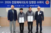 광주광역시체육회가 23일 15시 체육회관 중회의실에서 ‘2026 전문체육지도자 임명장 수여식’을 개최했다고 밝혔다. 수여식에는 전갑수 체육회장, 김영삼 사무처장, 전문체육지도자 등 관계자 50여명이 참석한 가운데 제107회 전국체육대회 등을 앞두고 훈련 지도에 전념하고 있는 지도자들을 임명하고 격려했다. 시 체육회는 육상, 복싱, 펜싱 등 27개 종목에 29명의 전문체육지도자들을 배치하여 지역 선수들의 경기력 향상과 체계적 선수 육성을 통한 지역 체육 경쟁력 강화를 도모한다. 모든 지도자는'국민체육진흥법'에 따른 전문체육지도자 자격을 갖춘 지도자로서 공공성과 전문성을 확보하여 선수 지도, 대회 참가 등 전문체육 전반을 담당한다. 이날 행사에서 지도자들은 올해 대표선수 경기력 향상 및 제107회 전국체전 상위 입상을 위해 최선을 다할 것을 다짐했다. 지난해 개최된 제106회 전국체전에서 광주선수단이 획득한 총 32,626점 가운데 시 체육회 소속 전문체육지도자들이 지도한 선수들이 6,824점을 획득하며 21%를 차지하는 성과를 거둔 바 있다. 시 체육회는 어려운 여건 속에서도 선수들의 훈