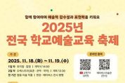 교육부와 17개 시‧도교육청은 11월 18일부터 11월 19일까지 경희대학교 평화의전당(서울)에서 2025년 전국 학교예술교육 축제를 개최한다. 2025년 전국 학교예술교육 축제는 전국의 초·중등 학생들이 협력형 예술 활동을 통해 예술적 감수성을 기를 수 있도록 지원하고, 전국 단위 예술교육 우수사례를 발굴·확산하기 위해 마련된 행사이다. 교육부는 17개 시‧도교육청과 함께 학생들의 예술적 소질 계발을 지원하고, 다양한 예술 분야 활동을 체험할 수 있도록 학생예술동아리 참여를 장려해 왔다. 이번 축제를 통해 학생들이 주도적으로 공연과 미술 작품 제작에 참여하는 경험을 쌓고, 예술로 공감·소통하는 학교문화를 확산할 계획이다. 올해 축제는 전국 초·중·고·특수학교 총 80개교 2,550여 명이 예선에 참가했으며, 심사를 거쳐 선발된 총 40개교 1,060여 명이 본선에 참여한다. 축제 개막식에는 작년 학교예술교육 축제 뮤지컬 부문에 입상한 광주동신여자중학교에서 축하공연(뮤지컬 갈라쇼)을 진행한다. 1일 차(11.18.(화))에는 뮤지컬 및 합창, 2일 차(11.19.(수))에는 오케스트라(표준, 관악, 국악) 공연