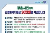 정읍시가 고물가와 경기 침체로 신음하는 시민들의 가계 부담을 덜어주기 위해 오는 19일부터 모든 시민에게 1인당 30만원의 민생회복지원금을 지급한다. 이번 지원금 지급은 2024년 말에 이어 두 번째로 시행되는 조치로, 시는 지난해에도 강도 높은 재정 혁신과 예산 절감 노력을 기울여 재원을 확보했다. 이를 시민들에게 환원해 지역 내 소비를 촉진하고 민생 경제에 활력을 불어넣겠다는 계획이다. 지급 대상은 2025년 12월 15일 이전부터 신청일 현재까지 정읍시에 주민등록을 두고 거주 중인 모든 시민이다. 여기에는 결혼이민자와 영주권자도 포함된다. 다만, 기준일 이후 사망했거나 타 지역으로 전출한 자, 주민등록이 말소된 경우에는 지급 대상에서 제외된다. 신청 기간은 오는 19일부터 2월 13일까지 4주간 진행된다. 지원금을 받으려는 시민은 2025년 12월 15일 기준 주소지 관할 읍·면·동 행정복지센터를 방문해 신청하면 된다. 본인 신청 시 신분증과 신청서를 지참해야 하며, 대리인이 방문할 경우 위임 동의서와 위임자 및 대리인의 신분증을 모두 챙겨야