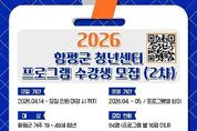 전남 함평군이 상반기 청년센터 프로그램 참여자를 모집한다. 함평군은 14일 “2026년 상반기 청년센터 프로그램 참여자를 2차 모집한다”고 밝혔다. 지원 대상은 공고일 기준 함평군에 주민등록을 두고 거주하고 있는 19세 이상 49세 이하 청년이다. 프로그램별로 최대 16명을 선착순 모집한다. 모집 대상 프로그램은 ▲공인중개사 자격증반 ▲온라인 마케팅 창업 교육 ▲영상 편집 교육 ▲성인 영어 회화반 등 총 4개다. 참여 희망자는 구비서류를 갖춰 네이버 폼 또는 전자우편으로 신청하면 된다. 군은 신청자에 대한 자격요건 확인 등을 거쳐 최종 선정자를 개별 통보하고, 최소 개강 인원(10명)에 미달한 강좌는 원활한 프로그램 운영을 위해 폐강 조치할 방침이다. 함평군 관계자는 “취·창업에 실질적으로 도움이 되는 양질의 교육으로 편성한 만큼 지역 청년들의 많은 관심과 참여를 바란다“고 말했다. 한편, 함평군 청년센터는 회의실(교육실), 컴퓨터 교육실, 스터디실, 공유 카페 등을 갖춘 청년 문화 복합 공간으로, 지난해 12월 정식 개소했다.